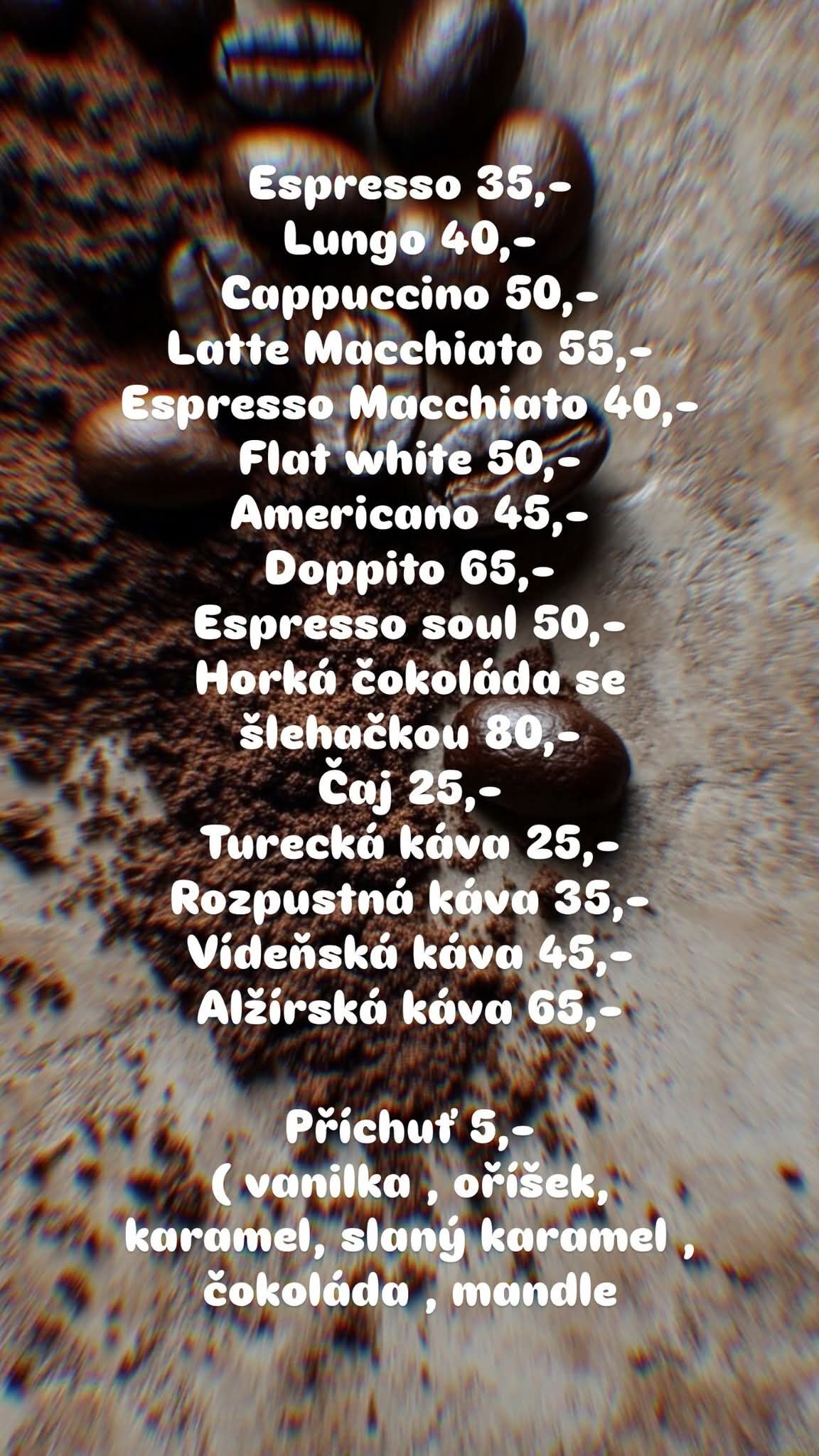 Nově jsme pro vás rozšířili i větší výběr kávy , od klasického espressa až po oblíbené mléčné speciality , ke každému šálku si můžete dopřát i naše domácí zákusky, jak se říká Sladká tečka , která potěší malé i velké.